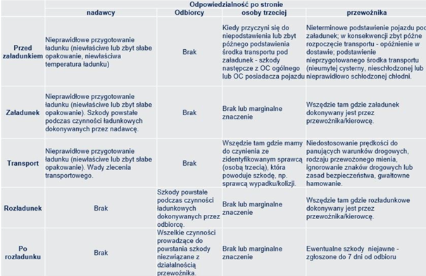 W procesie likwidacji szkody przez Ubezpieczyciela okazuje się bardzo często, że to nie przewoźnik ponosi odpowiedzialność za powstałą szkodę a sam odbiorca lub nadawca. Najczęstszą przyczyną szkód za jakie odpowiedzialność ponosi odbiorca lub nadawca jest nienależyte przygotowanie przesyłki do przewozu lub nienależyty jej załadunek lub rozładunek. To strony umowy spedycji lub przewozu regulują samodzielnie po czyjej stronie leży obowiązek czynności ładunkowych towaru. Bardzo często to czynności załadunku i zabezpieczenia towaru dokonują sami nadawcy a następstwa nienależytego załadunku lub zabezpieczenia na czas transportu ujawniają się podczas transportu. Dowieziony towar na rozładunek okazuje się uszkodzony na przykład w wyniku przesunięcia się palety z towarem. Automatycznie odbiorcy kierują roszczenie do przewoźnika, a ono często okazuje się niezasadne.
